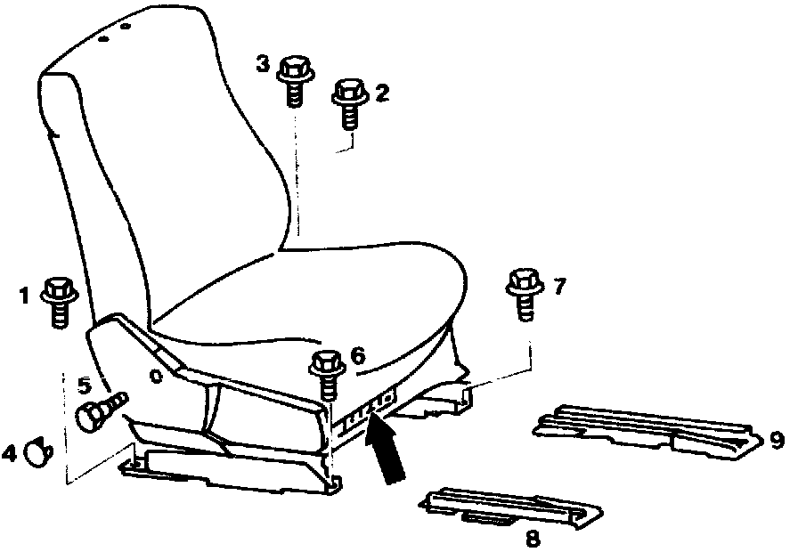 6 Screw out screws (2 each, arrows) at front of seat rails (25 Nm).