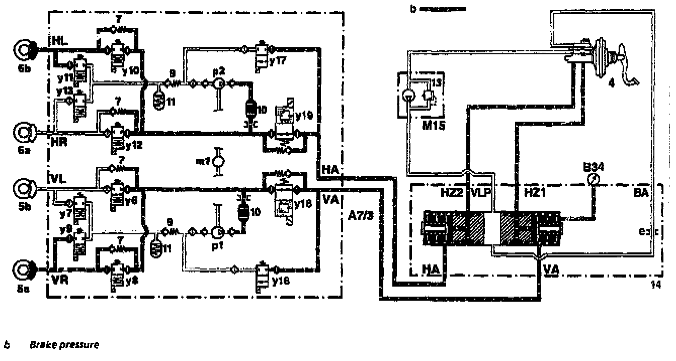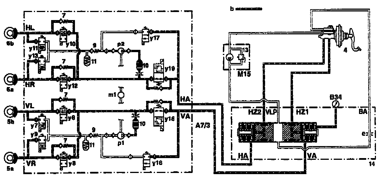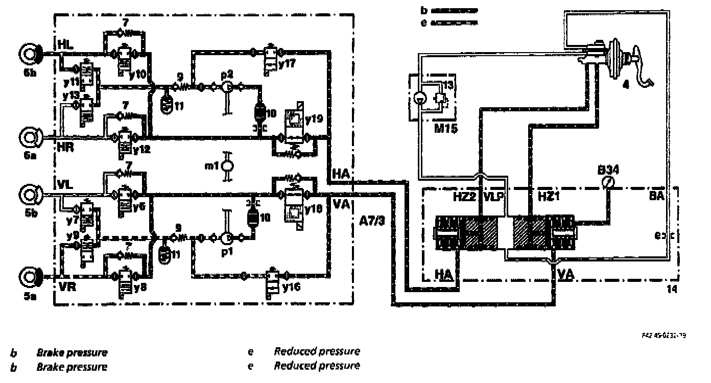 The brake pressure is built-up via the charging piston unit (14), the two switchover solenoid valves (y18 and y19) and the solenoid valves (y6. y8, y10 and y 12).