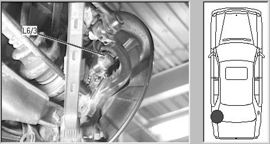 Beneath vehicle, on left rear wheel knuckle.