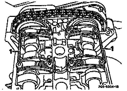 28. Rotate camshafts so that bottom edge of holes in camshaft flange form a level with top edge of the cylinder head and check with 4 mm pins (1).