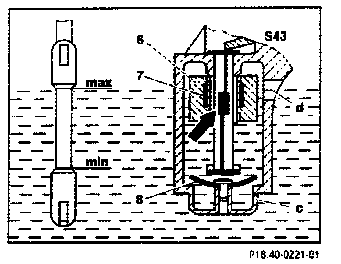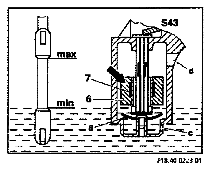 The oil level is measured with a float (6) with ring magnet (7) and a contact (arrow). The contact (arrow) is closed by the magnetic field of the ring magnet (7) depending on the position of the float (6). The contact (arrow) is open when engine oil level is less than "min", and closed when engine oil level is greater than "min". When contact (7) is closed, vehicle ground exists at the base plate in the instrument cluster and the indicator lamp (e.g. model 202: A1e12) does not come on.