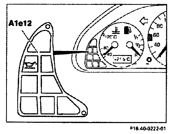 If the engine oil level is not sufficient, the contact (arrow) opens, the vehicle ground to base plate in the instrument cluster is interrupted and the indicator light (A1e12) comes on after a time delay of 60 seconds. The time delay of about 60 seconds prevents the indicator light (A1e12) coming on if the car is accelerated or braked sharply or when cornering.