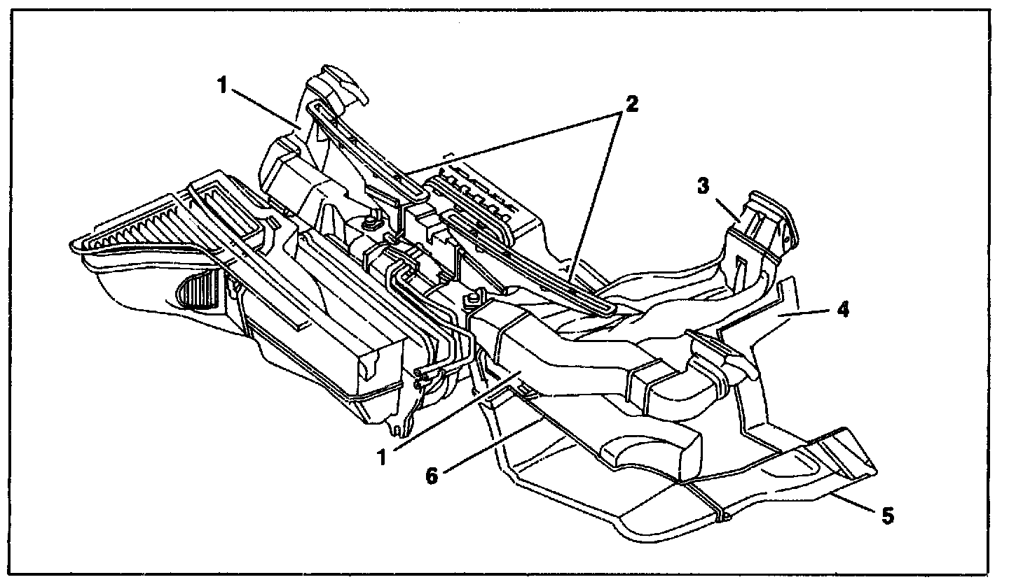 The rear A/C housing air duct to the rear footwell (4) is located below the center console (only with code 582).