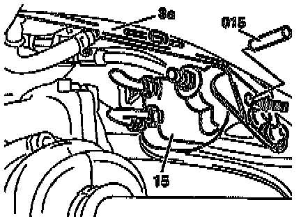 - Locate the adjusting lever of the level controller (15) through the hole (arrow) with a 4 mm alignment tool (015)