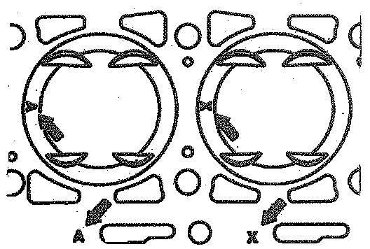 ^ The pistons are identified relative to the crankcase with the code letters A, X or B (arrows).