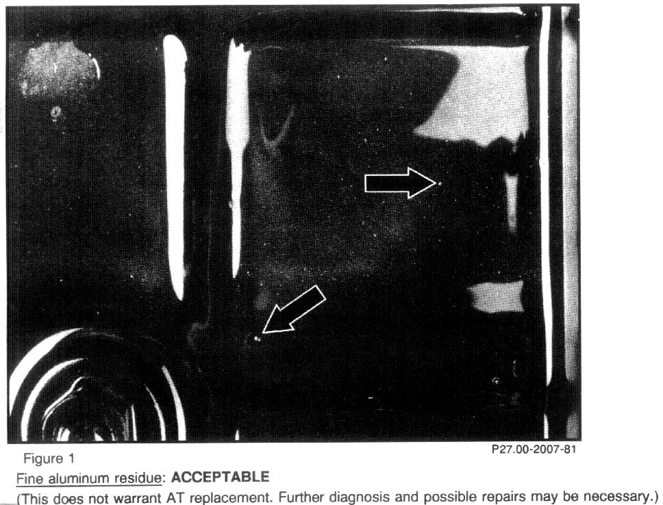 This bulletin serves as a guideline for determining whether to repair or replace an automatic transmission (type 722.6) based on residue found in the AT fluid. Figures 1 through 4 are examples of various levels of residue that might be found at the bottom of the AT fluid pan, and their limits of acceptability. A certain level of fine aluminum, or fine aluminum with brass, residue at the bottom of the fluid pan is normal and does not warrant AT replacement. Further diagnosis and repairs may be necessary in such cases. If unsure, consult your Regional Technical Coordinator.