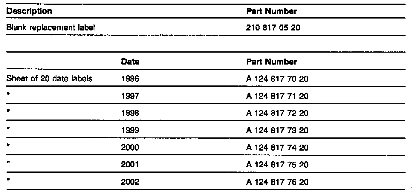 2. To determine which replacement date label insert to order, add 15 years to the production year of the vehicle (see "Determining proper replacement date label insert").