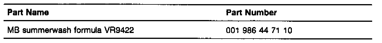 As of April production, MB summerwash concentrate formula VR9422 is being used to fill the windshield washer container replacing concentrate "S". This formula has been developed to improve windshield cleaning when using the windshield wipers and washers.