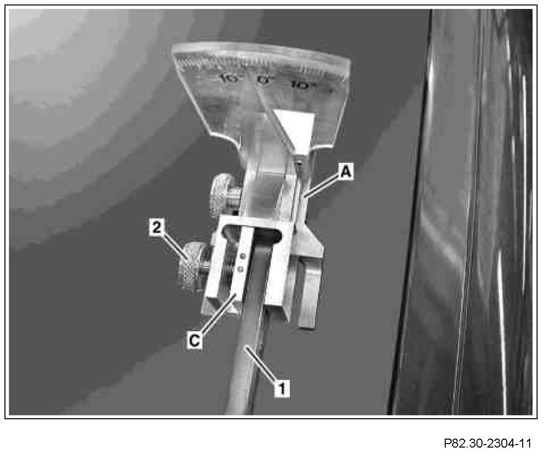 2 Securely clamp adapter (C) to angle gauge (A) by tightening the knurled bolt (2) at the head of the driver-side wiper arm (1).