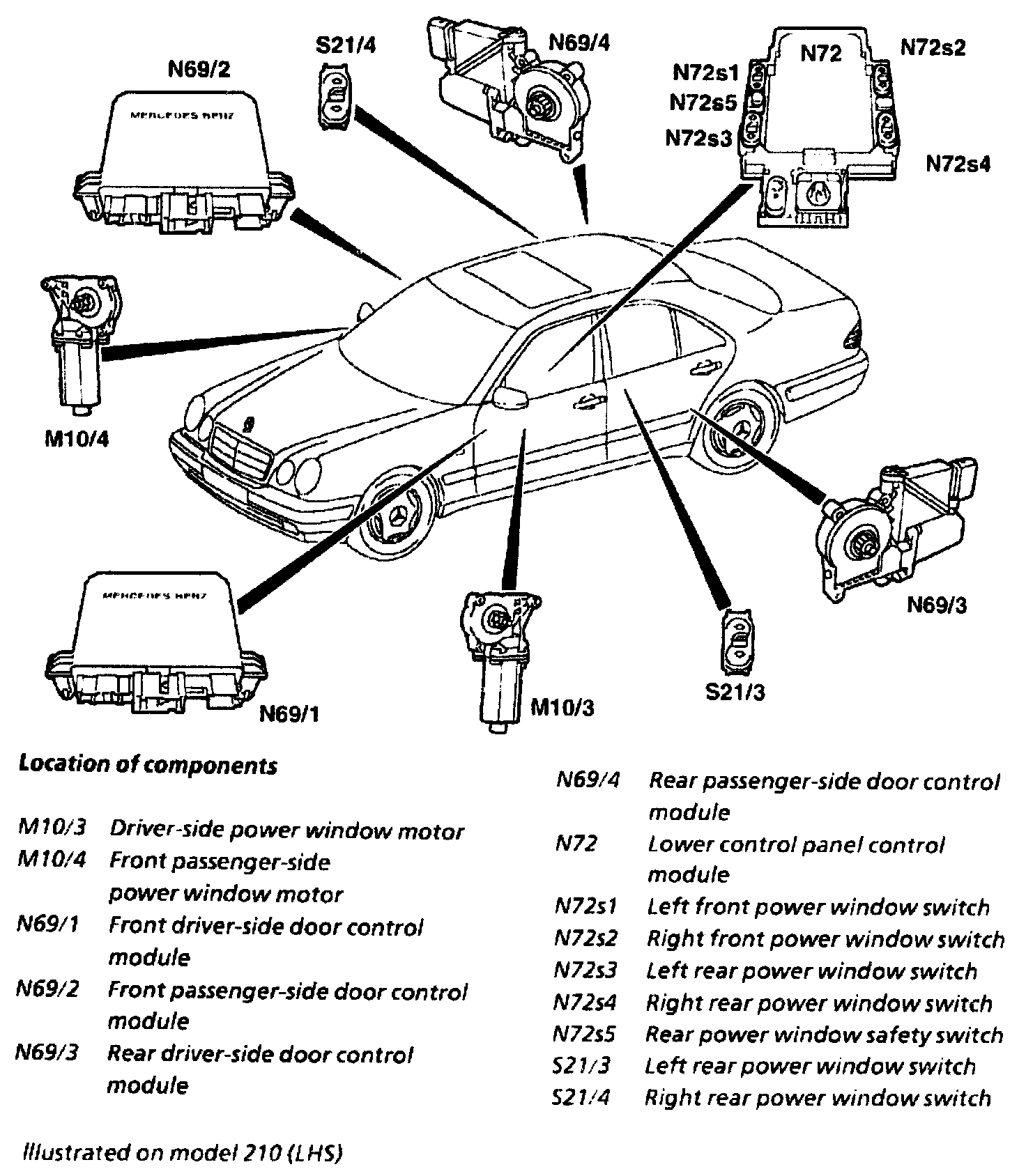 The rear door control module on the driver and passenger-side receives requests to open or close the window via the CAN bus. The control module actuates the built-in power window motor and senses the pulses front the Halt sensors in the power window motor for position recognition . In addition the door control module recognizes actuation of the power window switch in the rear door (S21/3) or (S21/4).