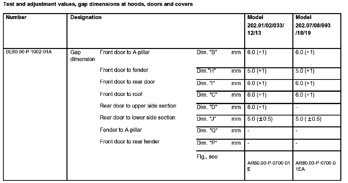 Test And Adjustment Values, Gap Dimensions At Hoods, Doors And Covers: