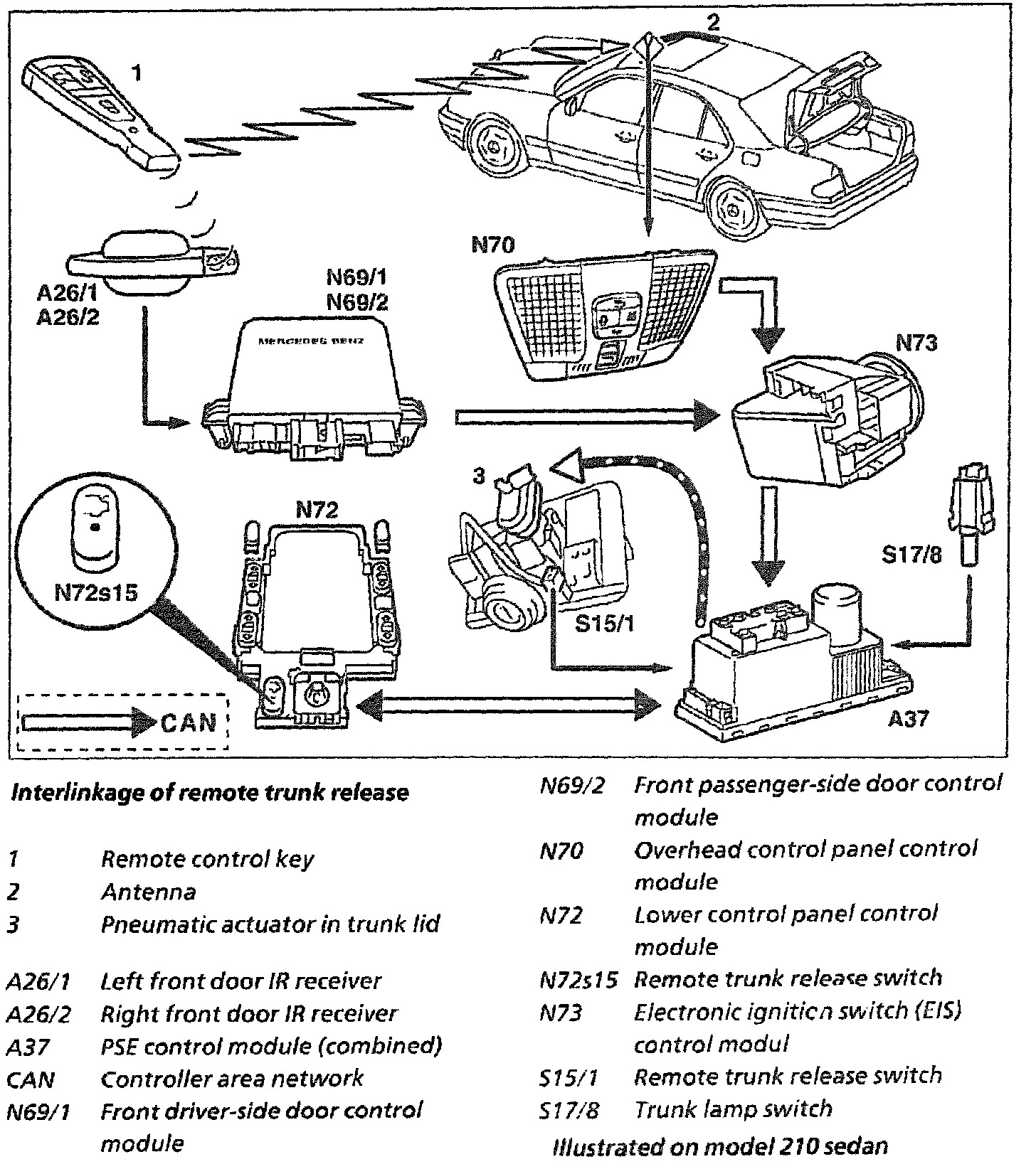 Actuation of the remote trunk release switch (N72s15) is recognized by the lower control panel control module (N72) and an instruction is sent via the CAN bus to the pneumatic system equipment (PSE) control module (A37) to open the trunk lid. The PSE control module opens the trunk lid pneumatically when the lock cylinder in the trunk lid lock is not locked mechanically by turning to the 90° position.