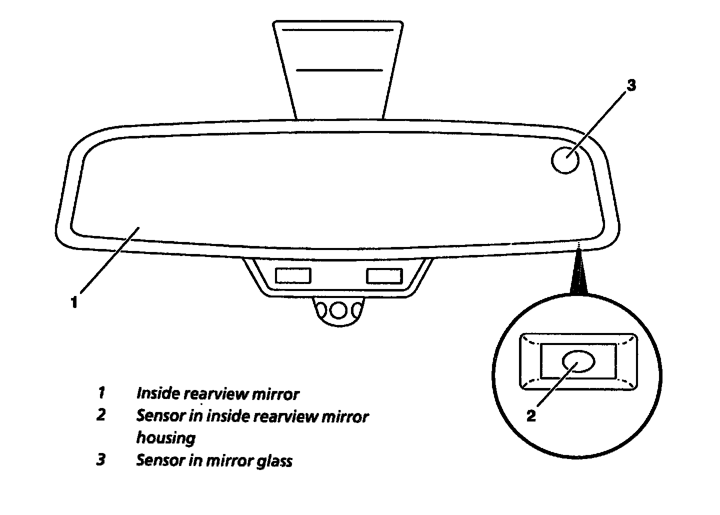 2 The ambient brightness is measured by a sensor (2) in the inside rearview mirror housing.