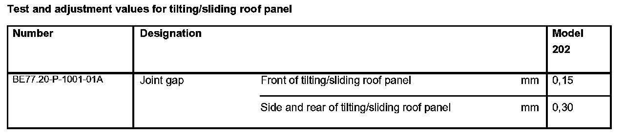 Test And Adjustment Values For Tilting/Sliding Roof Panel: