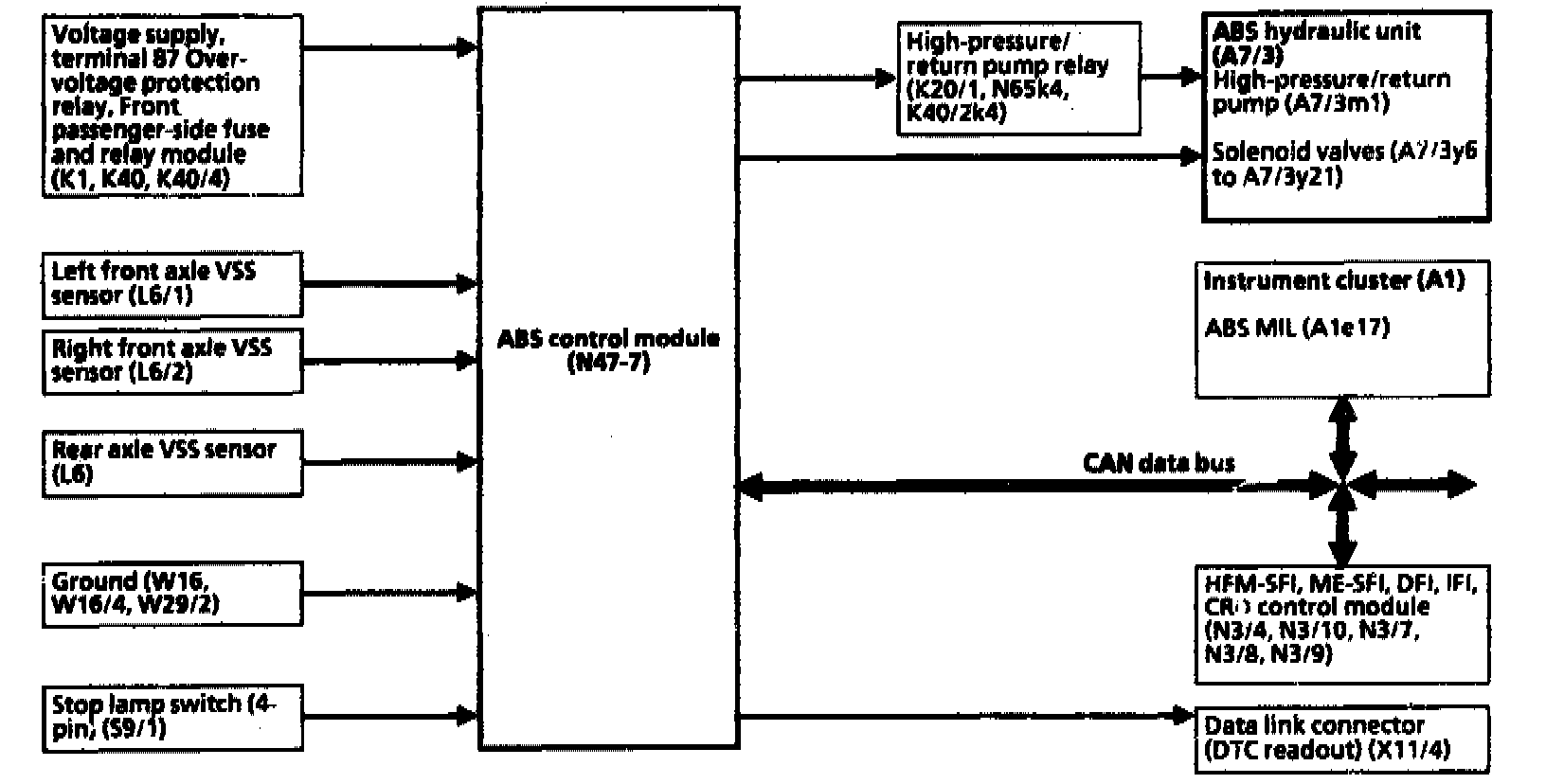 The ABS control module (N47-7) receives Input signals from the following components: