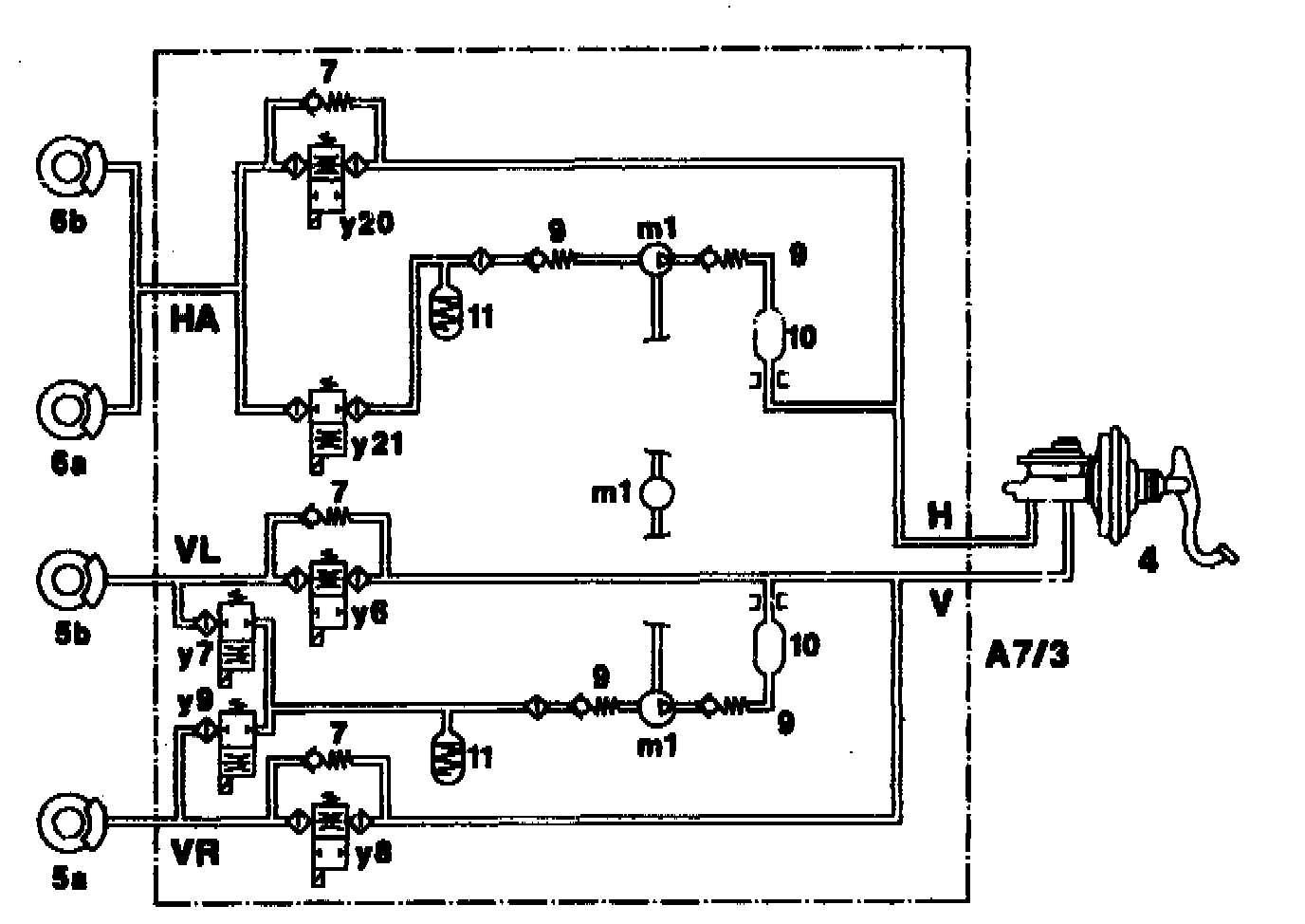 The high-pressure/return pump (m1) integrated in the hydraulic unit (A7/3) is used to return the brake fluid In the pressure reduction phase. In the ABS control phase it is not possible to increase the pressure compared with the pressure adjusted by the master brake cylinder.
