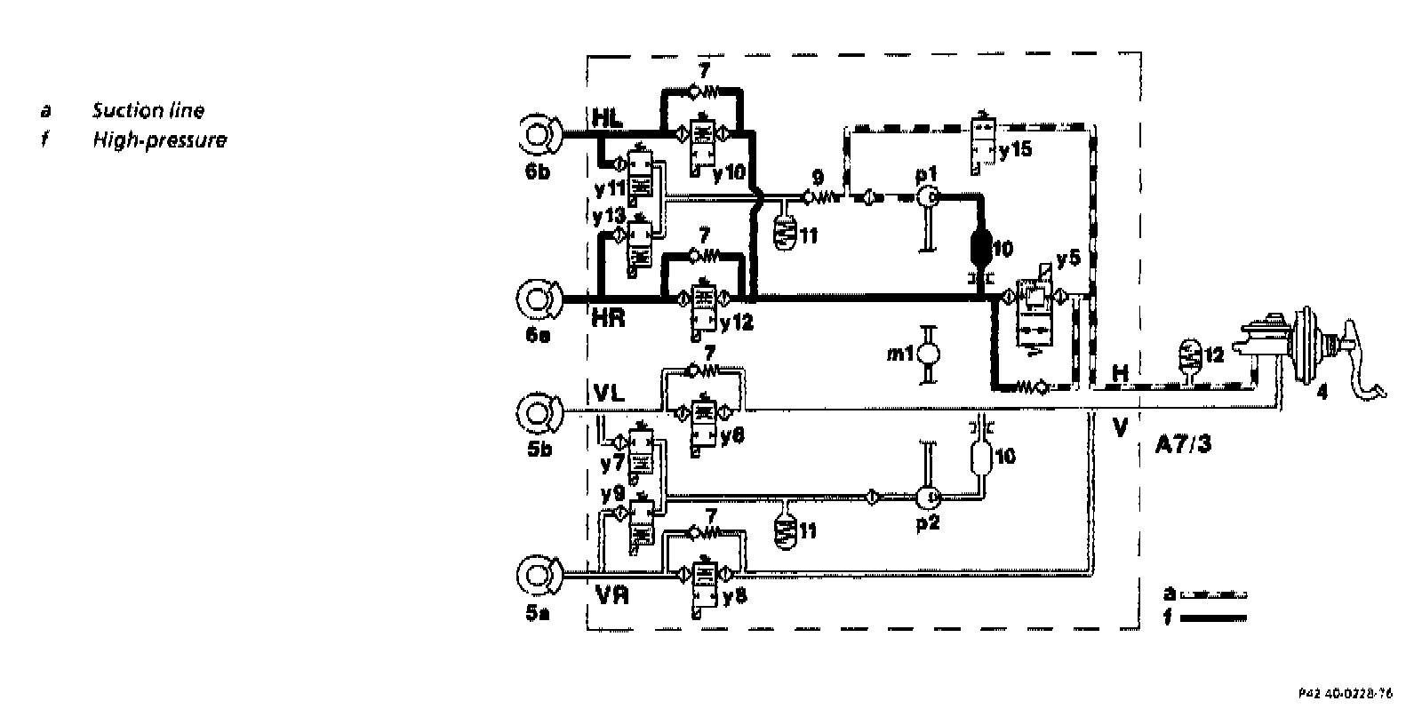 The pressure limiting valve integrated in the switchover solenoid valve (y5) is used for high-pressure limiting (approx. 160 bar). The diaphragm discharge damper (12) is used to reduce noise.