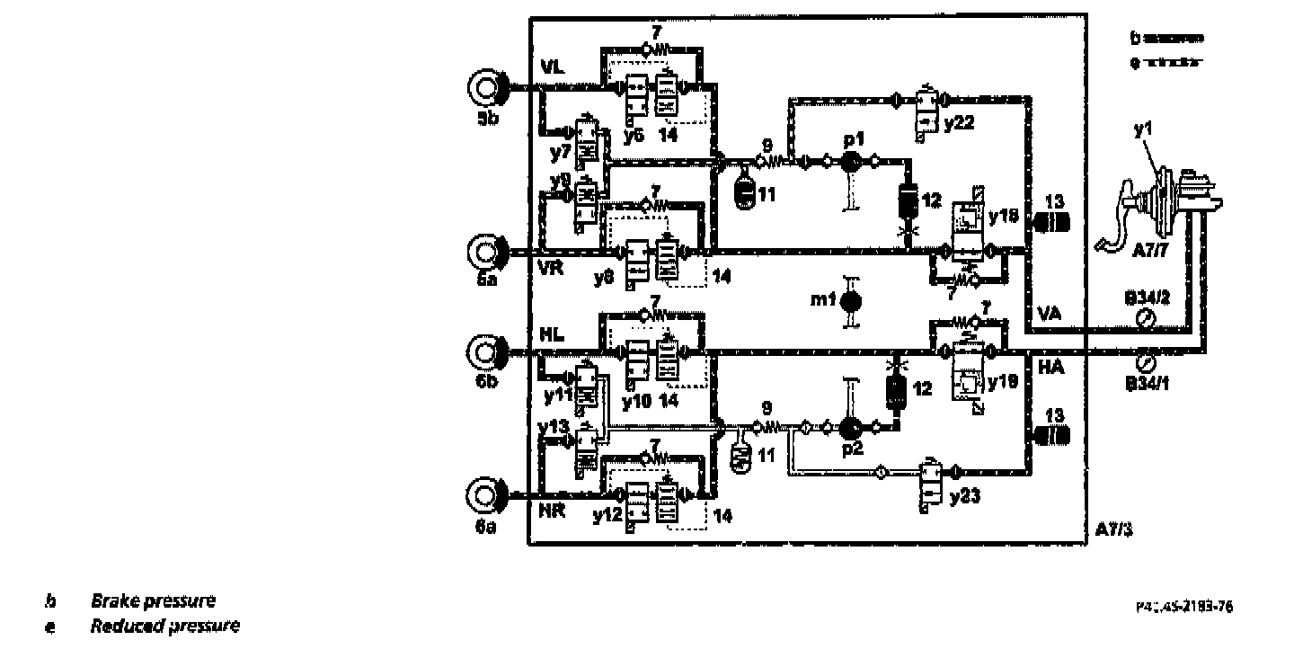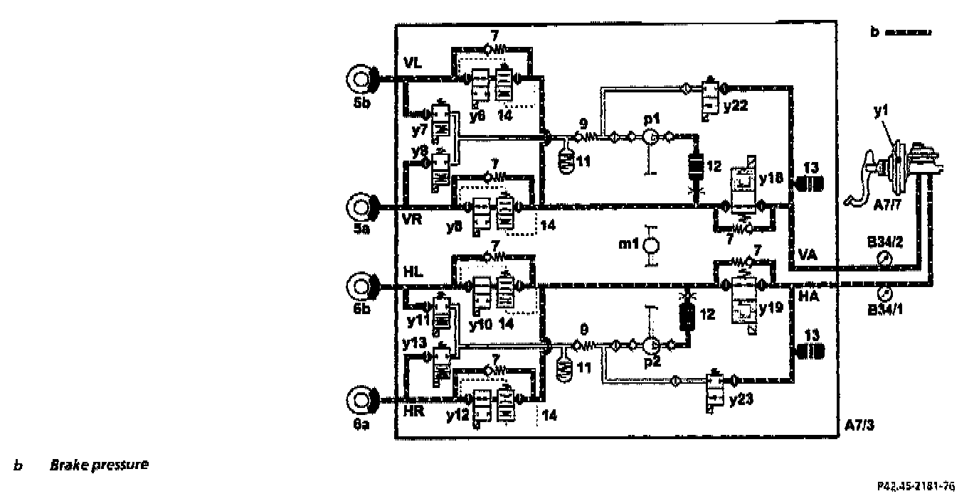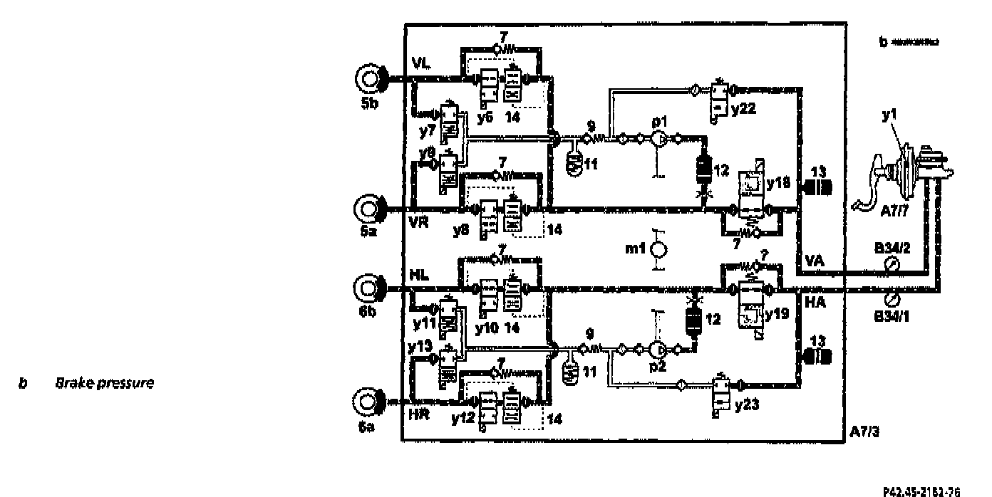 The brake pressure is built up via the two switchover solenoid valves (y18 and y19) and the solenoid valves (y6, y8, y10 and y12). During an ABS control process this pressure build-up phase can take place individually at each wheel.