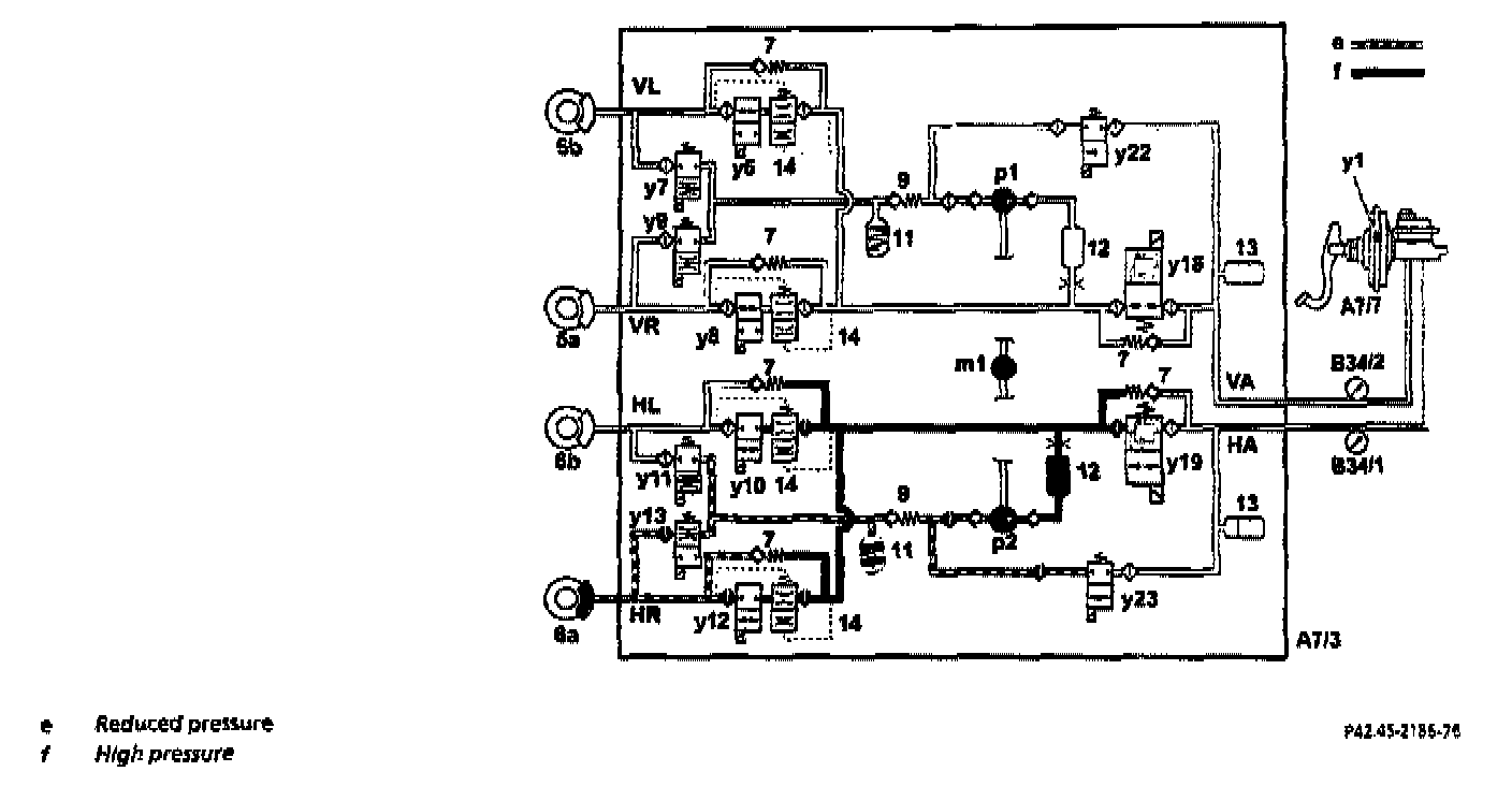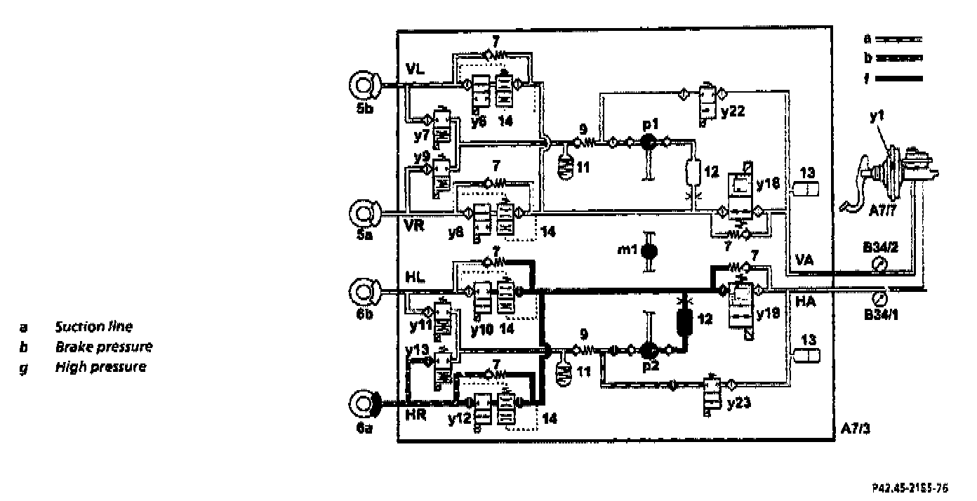 At the start of ASR control the switchover solenoid valve of the rear axle circuit (y19) is switched to the "shut-off position" (closed) and the high-pressured return pump (m1) is actuated.