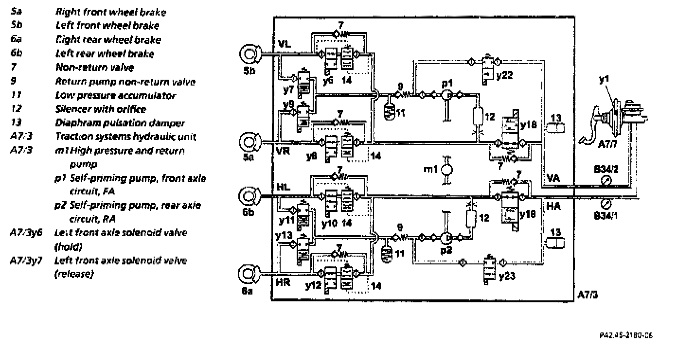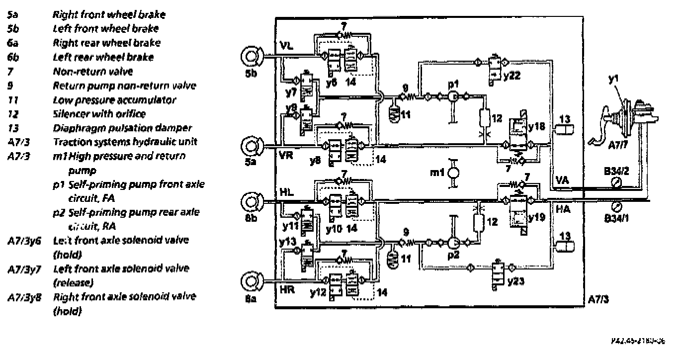 The self-priming high pressure and return pumps (p1, p2) integrated in the traction systems hydraulic unit (A7/3) are actuated in cycles for pressure build-up/pressure reduction during ASR/ESP controls and for return flow during ABS controls.