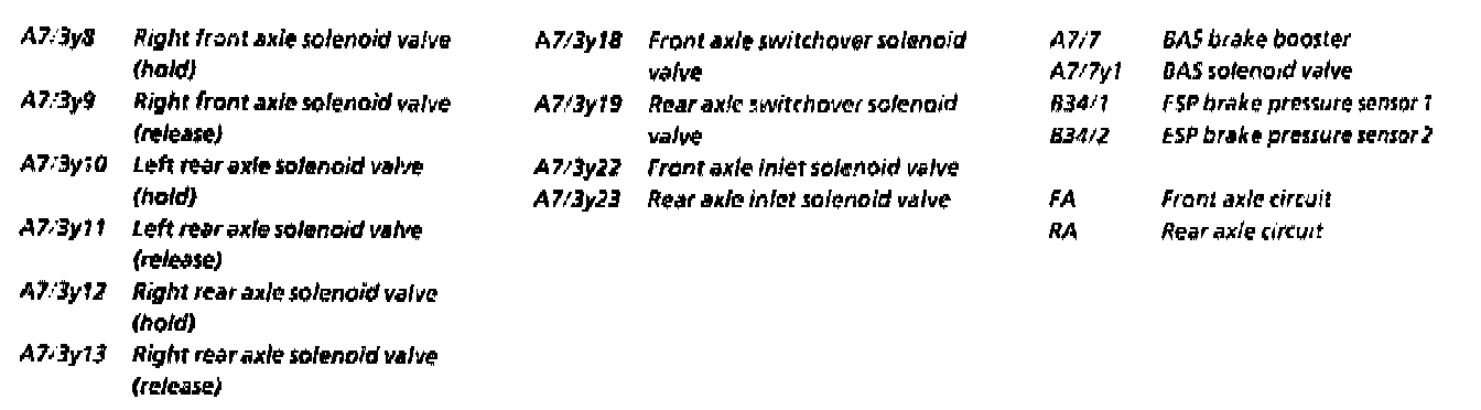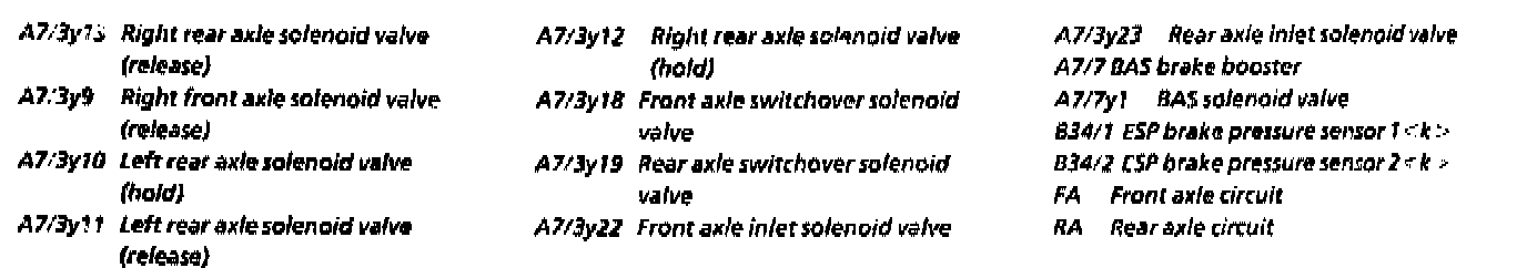 During ASR and ESP controls the switchover solenoid valves (y18 and y19) shut off whichever the RA and FA high-pressure circuits is active at the time from the master brake cylinder. At the same time they are designed as pressure limiting valves and open at pressure values greater than 150 bar. The brake fluid flowing away via the switchover solenoid valves is led back to the master brake cylinder.