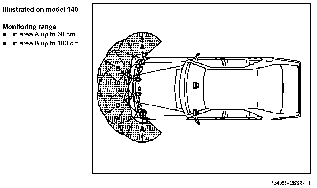 An obstacle is no longer detected at a distance below approx. 20 cm in the vehicle center and approx.15cm (model 168: approx. 20 cm) at the outside of the vehicle.