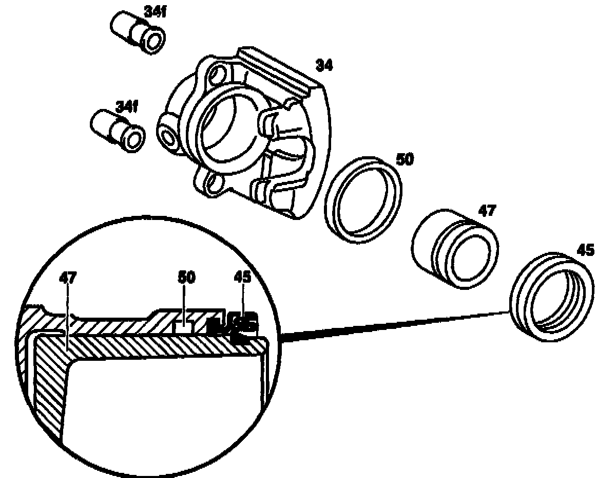 6. Check piston (47) and cylinder bore on floating caliper (34). replace, if necessary