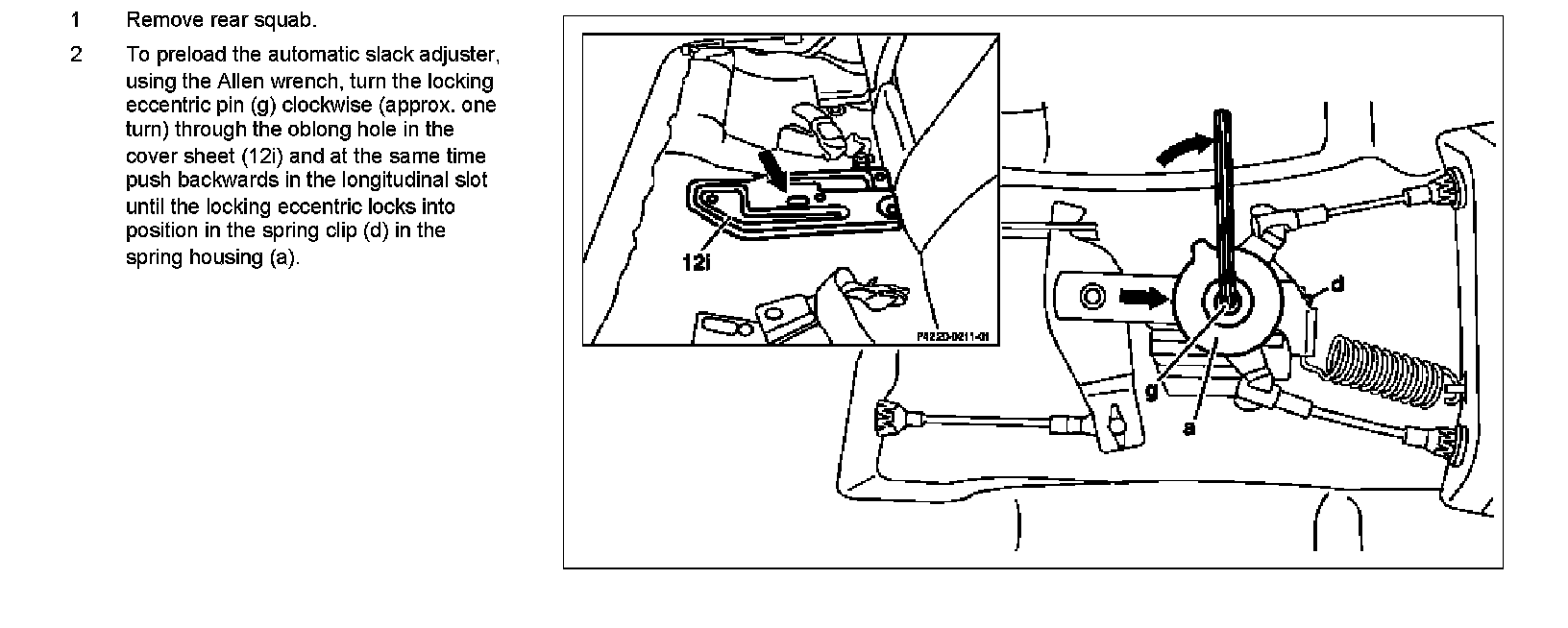 2. To preload the automatic slack adjuster, using the Allen wrench, turn the locking eccentric pin (9) clockwise (approximately. one turn) through the oblong hole in the cover sheet (1 2i) and at the same time push backwards in the longitudinal slot until the locking eccentric locks into position in the spring clip (d) in the spring housing (a).