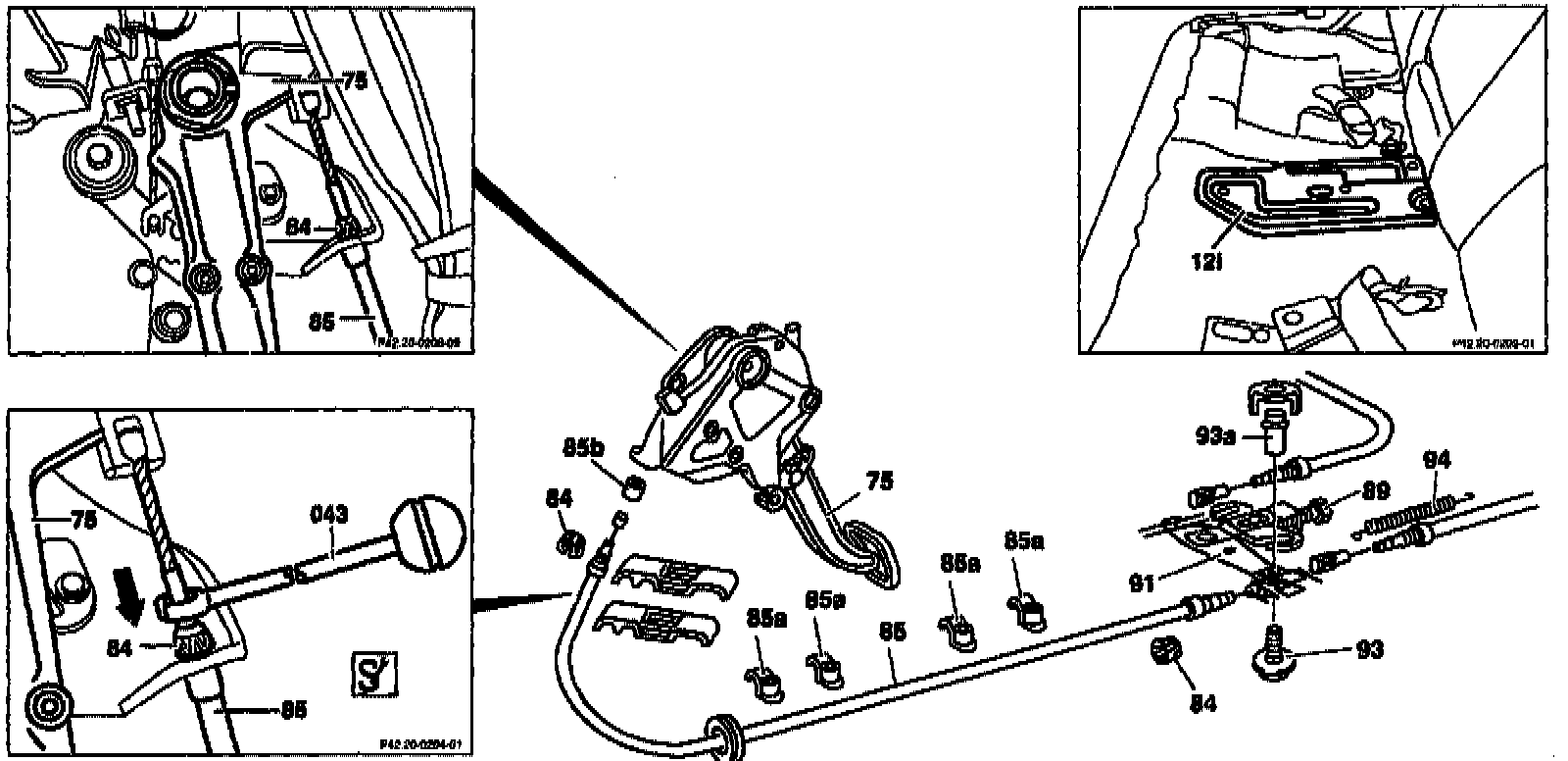 7. Detach brake control cable (85) on intermediate lever (91) and vehicle floor.