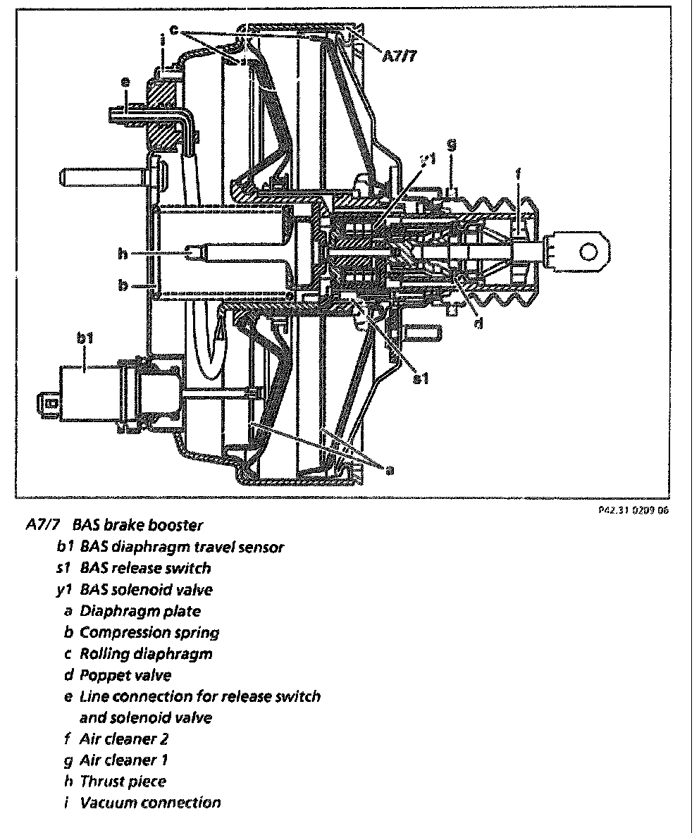 Emergency braking is established by the BAS control module by means of the BAS diaphragm travel sensor (b1). With BAS braking the BAS solenoid valve (y1) opens the valve (d) which introduces atmospheric pressure from the air cleaners (g and f) to the backs of the rolling diaphragms. The full boost pressure of the brake booster is transmitted to the master brake cylinder by the thrust piece (h).