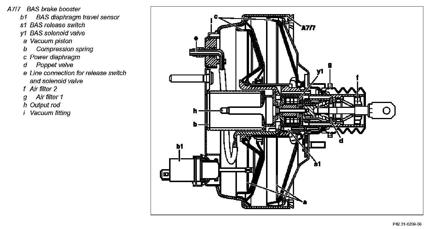 An emergency stop is detected by the BAS control unit via the BAS diaphragm travel sensor (b1). In the case of a BAS brake application, the BAS solenoid valve (y1) opens valve (d), which admits atmospheric pressure from inside the vehicle via the air filters (g and f) to the rear of the power diaphragms (c).