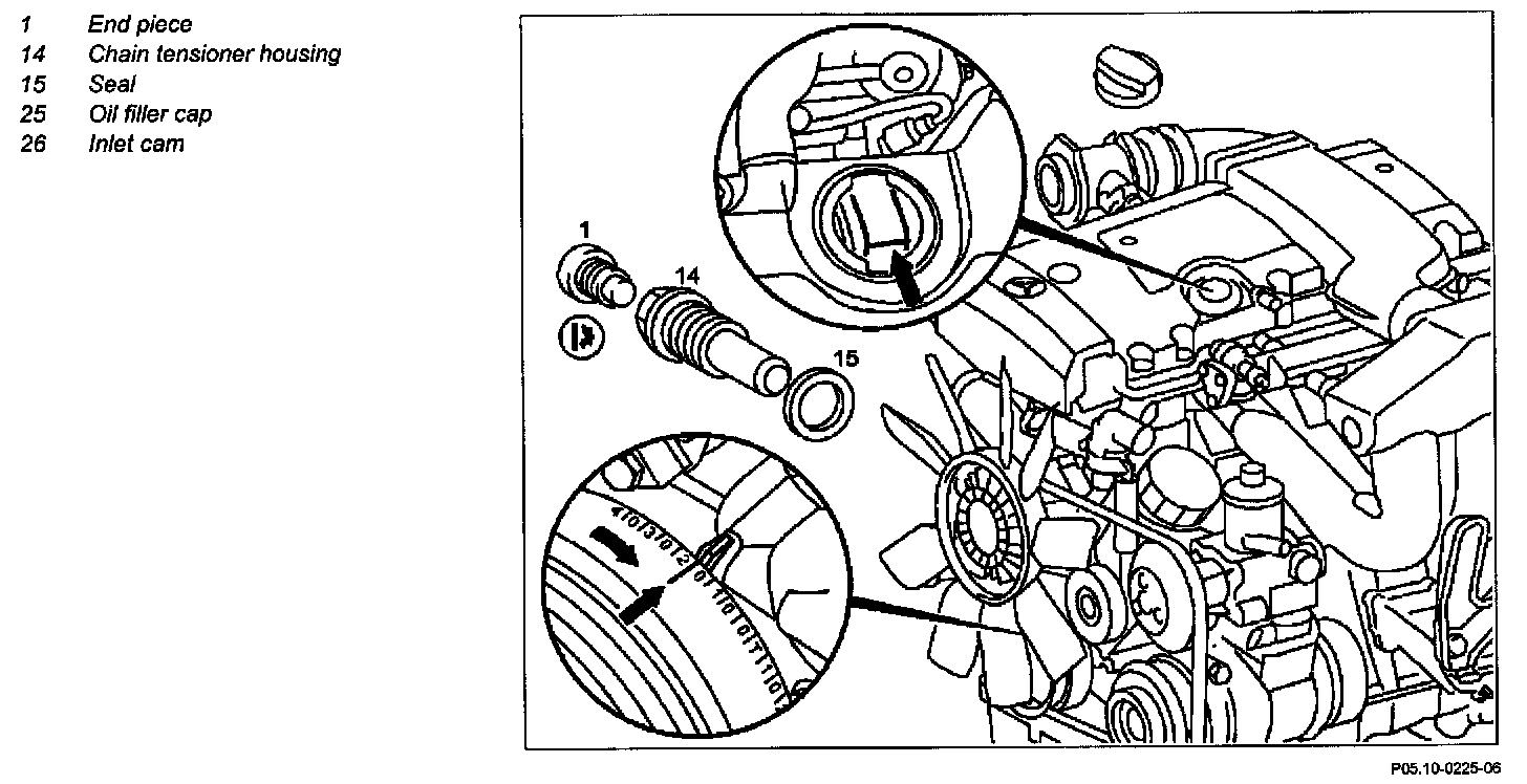 - To check whether cylinder 1 is at 20 degrees after ignition TDC, take off oil filler cap (25). The lobes of the inlet cams (arrow) of cylinder 1 must be facing up at an angle.