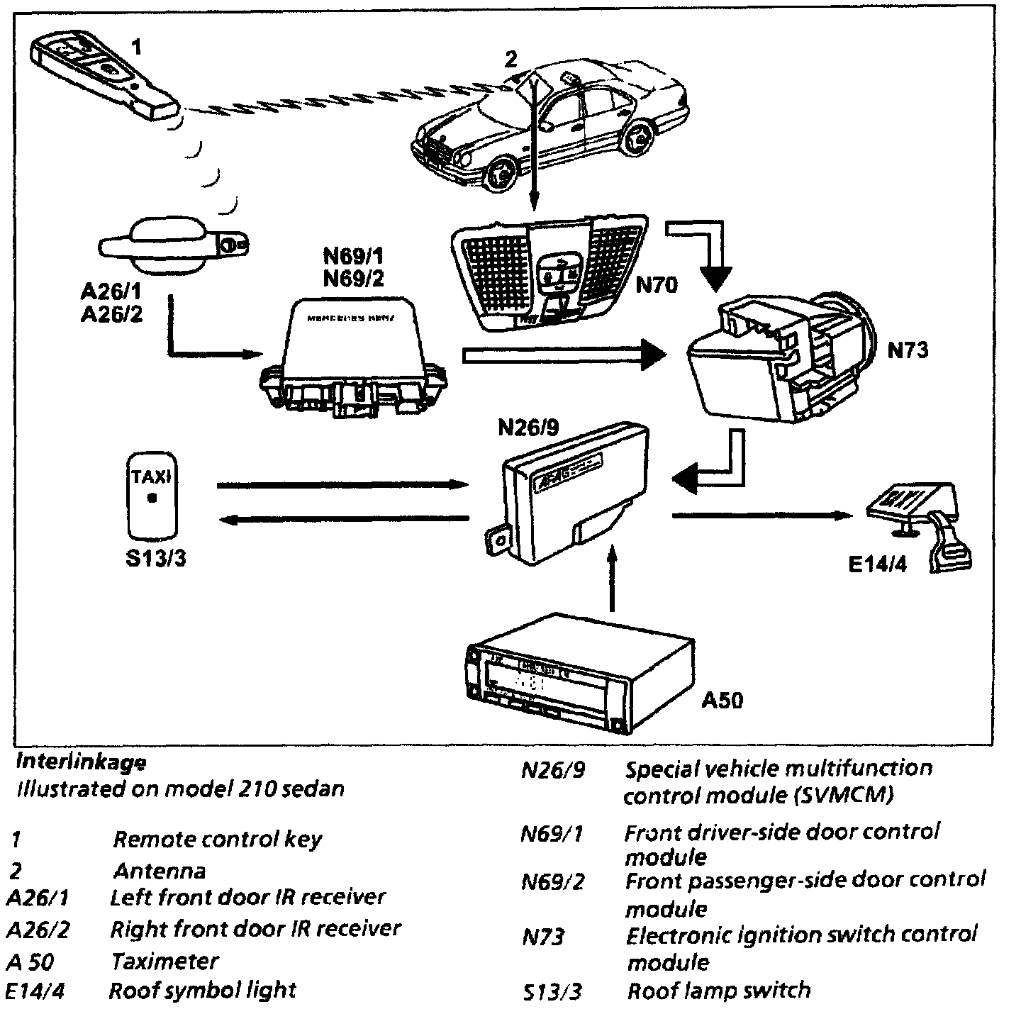 When the taximeter (A50) is set to "FREE" the control lead to the special vehicle multifunction control module (SVMCM) (N26/9) is under power. The SVMCM switches the roof symbol light (E14/4) on. As soon as the taxi meter is switched to the calculation mode, the power is switched off to the control lead from the taximeter to the SVMCM and the SVMCM switches off the roof symbol light.