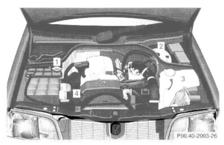 The engine compartment of model C 230 Kompressor is illustrated.: