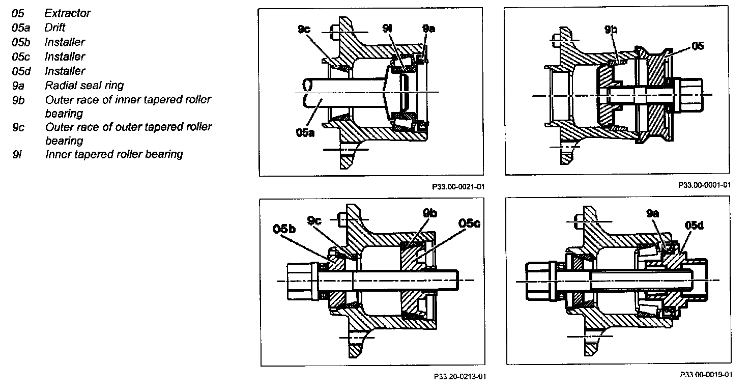 4 Pull bearing race of inner tapered roller bearing (9b) out of front wheel hub using extractor (05)
