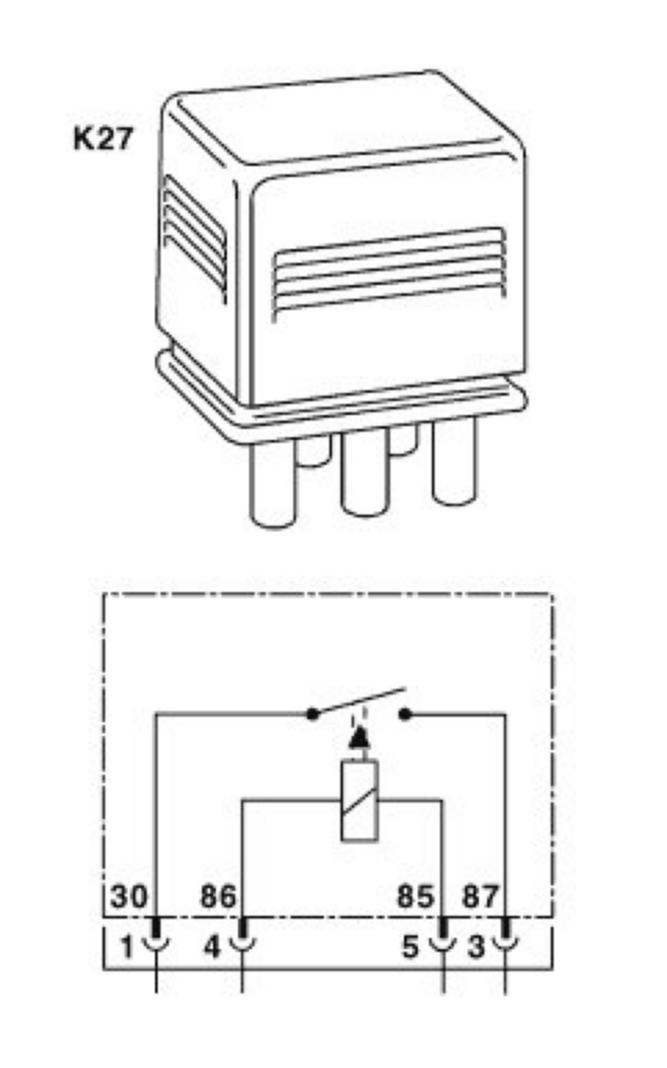 The fuel pump relay (K27) is switched by a ground signal from the control unit at terminal 86. If the contact is closed, the fuel pump (M3) is connected to terminal 30 (B+) via terminal 87. Circuit 30 is protected by a 30 A fuse.