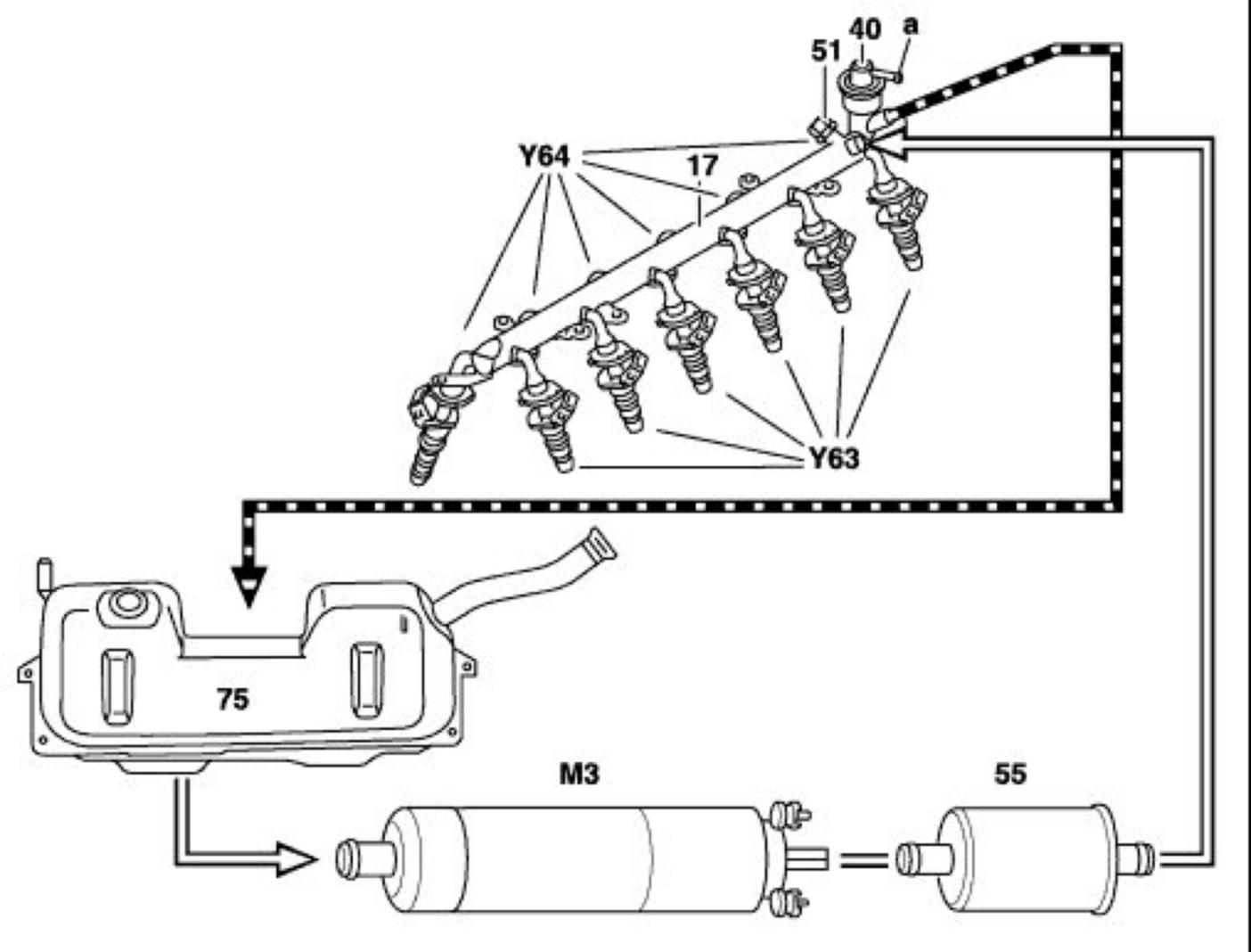 The fuel pump (M3) draws the fuel out of the fuel tank (75) and pumps it through the fuel filter (55) to the injectors connected to the fuel rail (17). The fuel pressure is controlled between 3.2 to 4.2 bar by the diaphragm pressure regulator (40) in line with the intake manifold pressure.