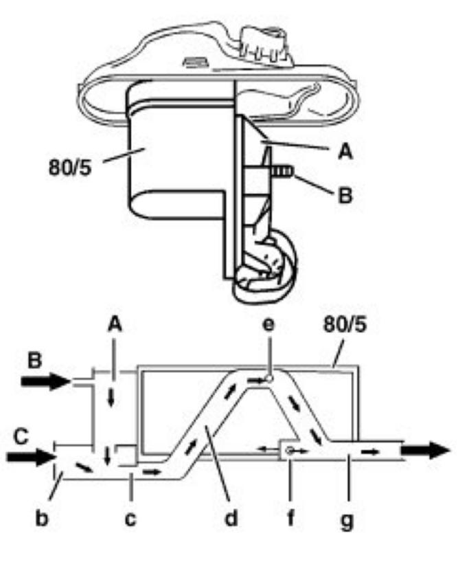 The fuel from the left fuel tank chamber is delivered to the defoamer (A) via the feed (B). From there and from the right fuel tank chamber (feed bore C), the fuel enters the storage tank (b) open at the top, from which it is drawn in by the fuel pump via the openings (c), the pipe (d) and the connection (g). The splashpot (80/5) is vented via the bore (e) and filled with fuel via the bore (f). If not enough or no fuel can be drawn in via the storage tank (b) when the fuel level in the tank is low and under unfavorable driving conditions, the air drawn in through the opening (c) enters the splashpot through the bore (e) while at the same time the corresponding volume of fuel is removed through the bore (f).