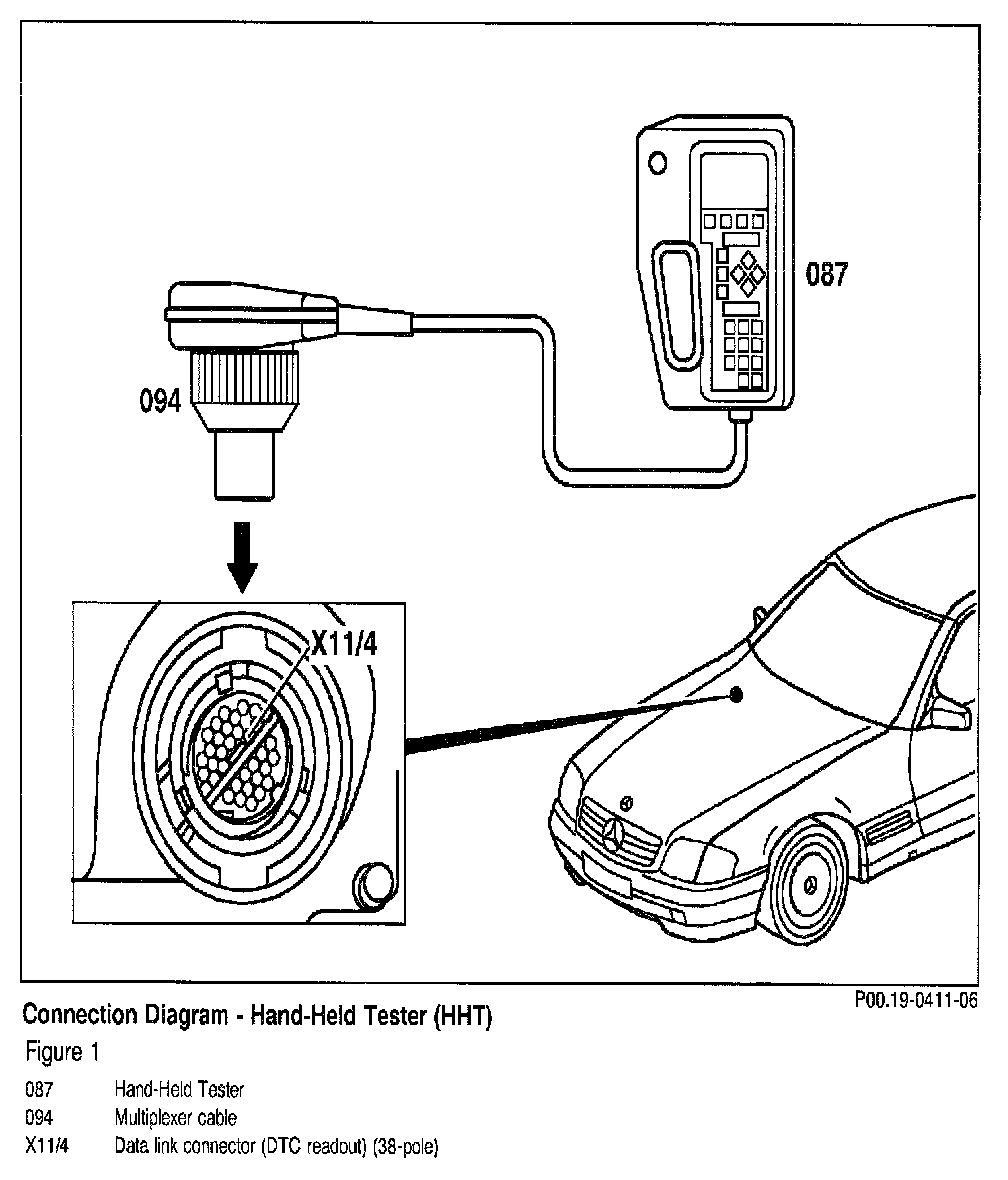 3. Connect HHT (087) with test cable (097) to data link connector (X11/4). Readout DTC fault codes.