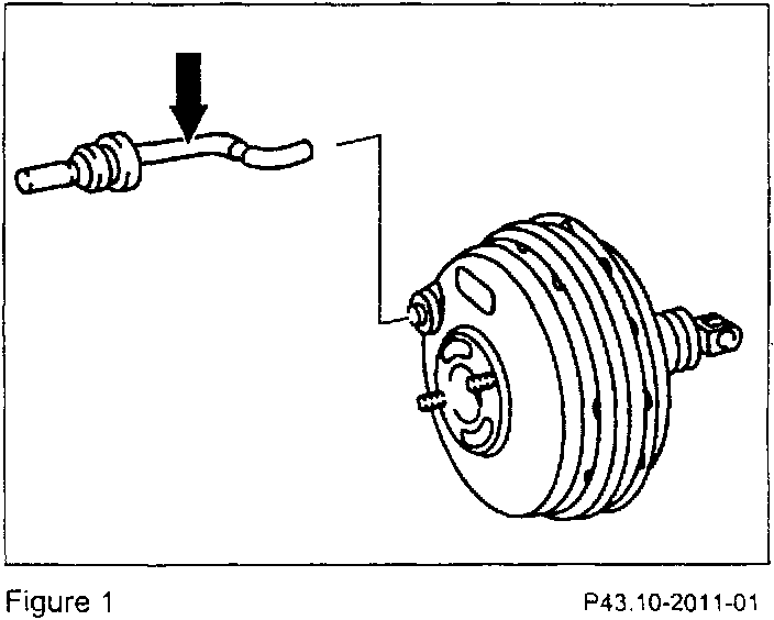1. Replace the existing brake booster hose (Figure 1) with the modified brake booster hose (part number A 170 430 1729 for Model 170.447 and A 202 430 6029 for Model 202.024).
