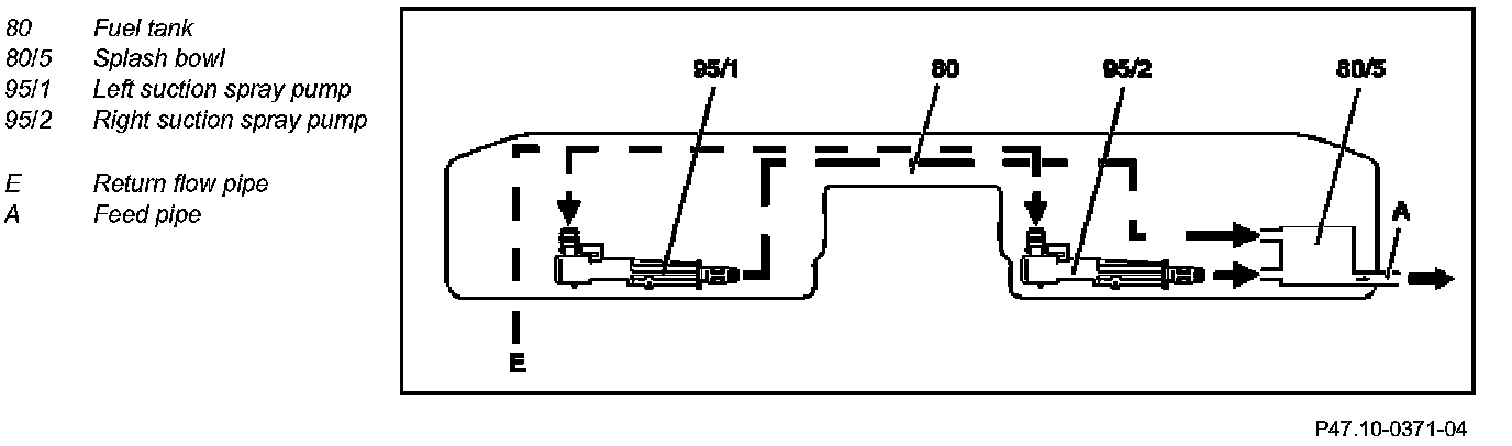 The fuel flows from the return flow pipe (E) as a partial flow through the suction spray pump (95/1) in the left chamber of the fuel tank and the remaining quantity through the second suction spray pump (95/2) in the left chamber of the fuel tank along the connection pipes to the splash bowl (80/5) in the right chamber of the fuel tank.