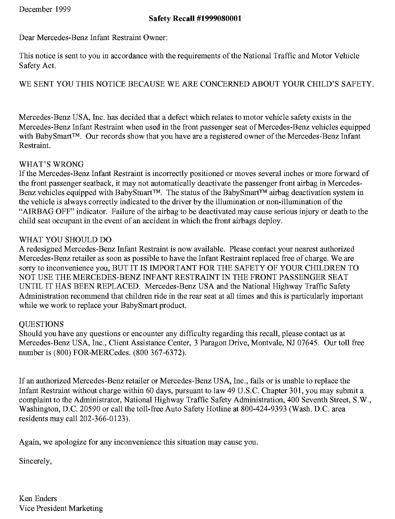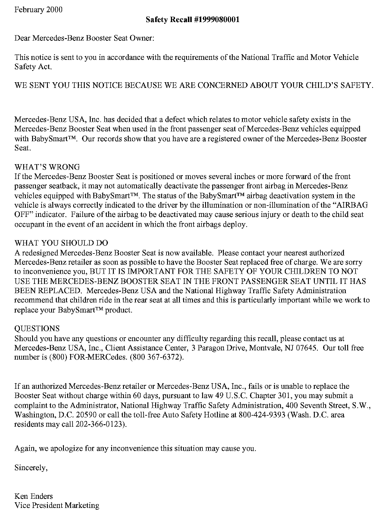 Included are sample second notification letters that will be mailed as applicable, to all registered Mercedes-Benz BabySmart-compatible Infant Restraint owners in December 1999 and Booster Seat owners in February 2000. The letters instruct clients to contact their nearest Mercedes-Benz Center to have their BabySmart-compatible Infant Restraints and Booster Seats exchanged free-of-charge.