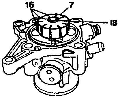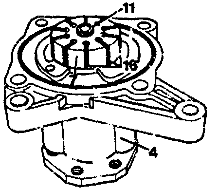 8. Detach rotor (7) from the drive shaft (11) with a plastic-headed hammer and take off together with the vanes (10 off). Check the vanes (16) in the grooves of the rotor (7); they must slide easily in the rotor.