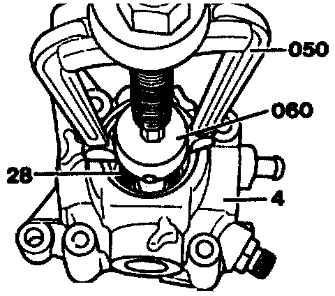 21. Pull out radial seal ring and washer (28) with internal extractor 000 589 33 33 00. Examine bronze bush in housing (4) for signs of damage and wear, replace housing if necessary.