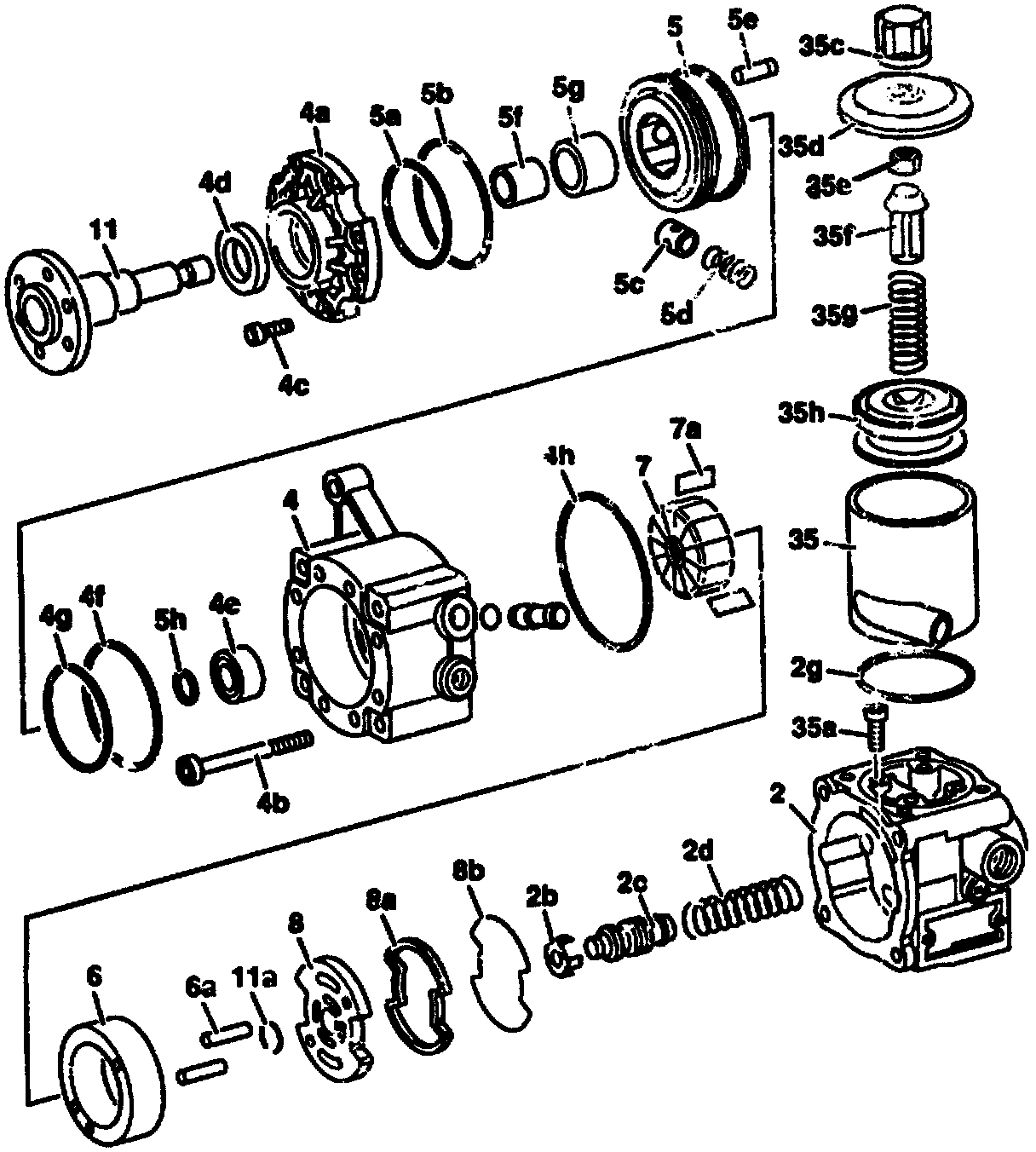 CAUTION: When removing the locking ring, ensure that the housing bore is not damaged. Check the ground surfaces of the flow control valve (2c) and the bore in the pump housing for wear and damage. If scores are found on the sliding surfaces, the tandem pump must be replaced.