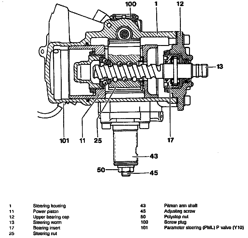 If the steering worm (13) is turned, the steering nut (25) with the power piston (11) is moved axially in the steering housing via the ball