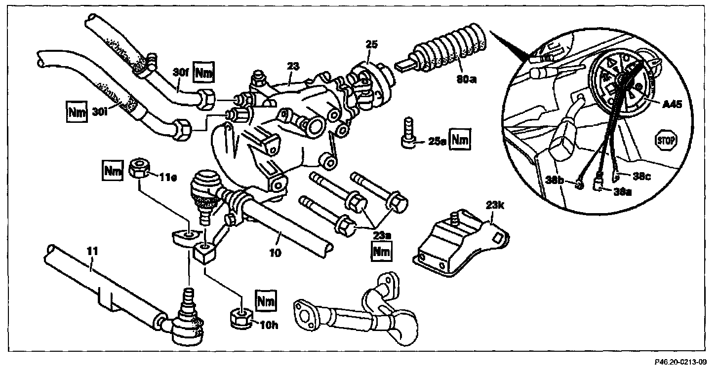 19 Install steering gear, moving the steering coupling (25) into the steering shaft (80a) at the same time