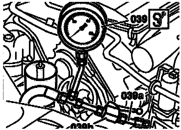 4. Connect tester (039) tool No. 124 589 06 21 00, or equivalent, between power steering pump and high pressure stretch hose, using connectors tool No. 210 589 09 63 00, or equivalent