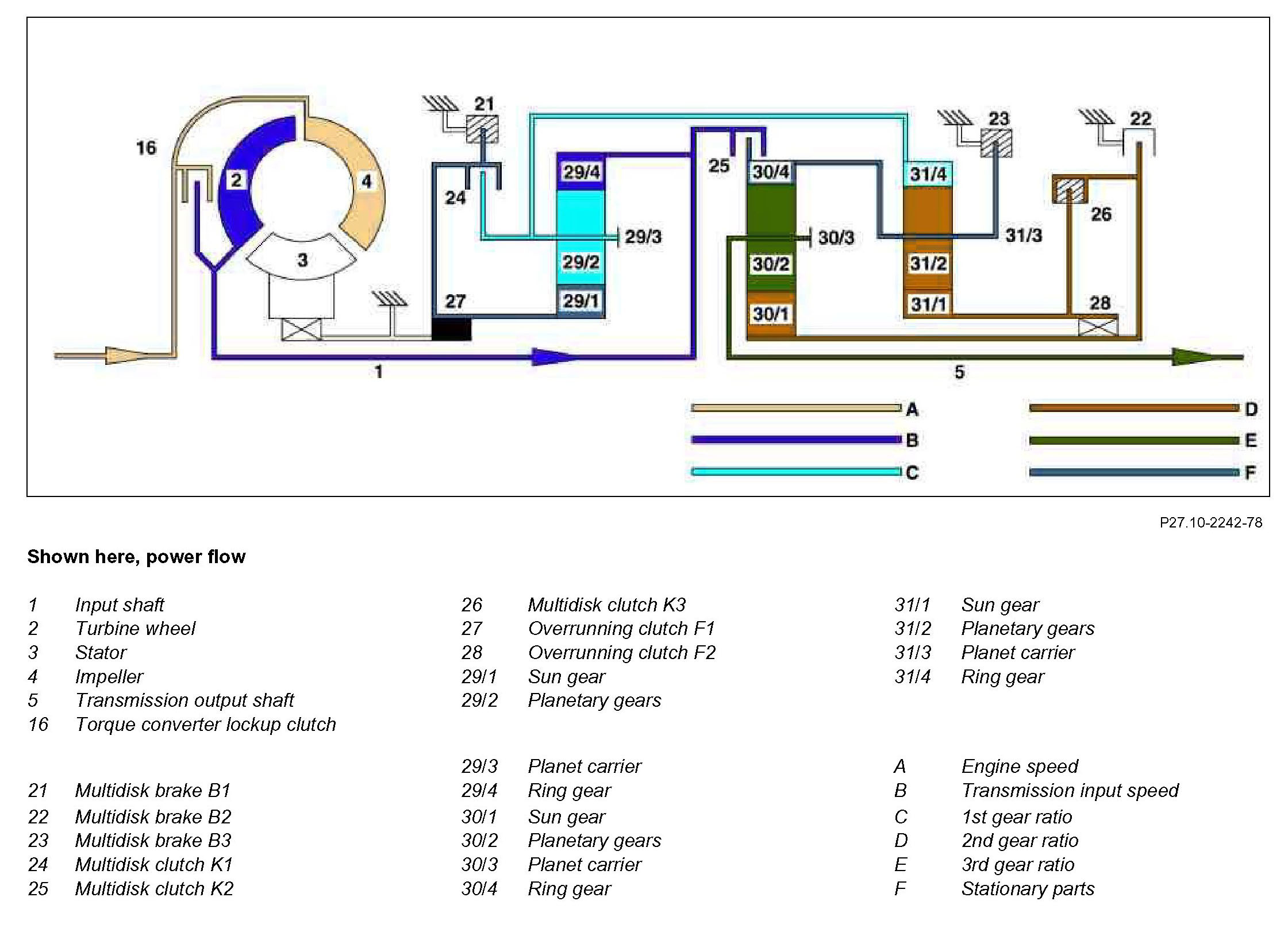 The input shaft (1) drives the ring gear (29/4). In drive mode, the sun gear (29/1) is supported at the housing via the locked overrunning clutch F1 (27) and, in overrun mode, via the engaged multidisk brake B1 (21). The planetary gears (29/2) roll on the fixed sun gear (29/1) and take care of a torque increase when the power is transmitted from the ring gear (29/4) to the planet carrier (29/3). The planet carrier (29/3) moves at reduced speed in the direction of engine rotation.
