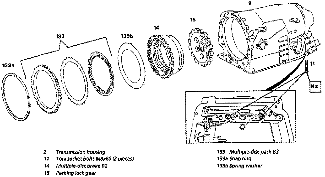 - To facilitate removal of the snap ring (133a), compress the multiple-disc pack B3 (133)